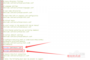 接着搜索以下内容:【Include conf/vhosts.conf】,在其下面增加一条引用内容:【Include conf/vhostssl.conf】,